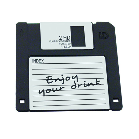 Sottobicchiere Floppy Disc in gomma naturale a forma di floppy disc. Adatto per servire cocktail particolari.