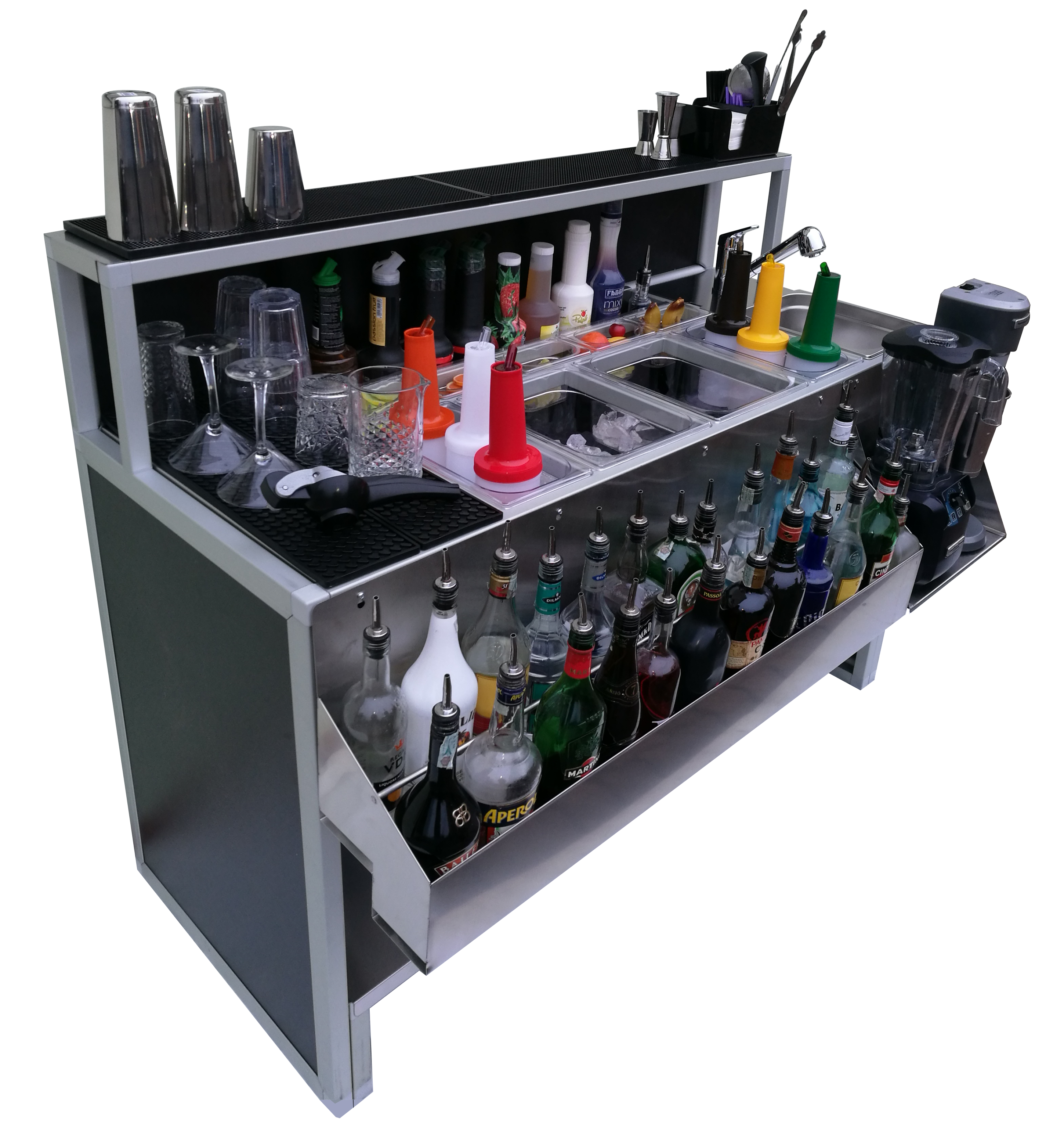 La nostra bar station più completa. In 150 cm di spazio ha tutto il necessario, lavandino e rubinetto compresi. Adatta per Bar, ristoranti, Hotel, Catering, Stabilimenti balneari e per qualsiasi locale, in quanto può essere sia incastrata all'interno di un banco bar già esistente. Può essere utilizzata all'esterno in quanto completamente smontabile.