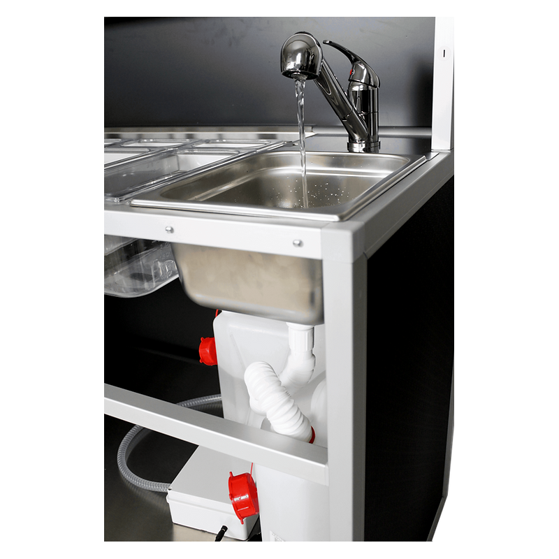 Una tanica è per il carico e va riempita d'acqua e l'altra per lo scarico dell'acqua dal lavandino. La dimensione è adatta ad entrare all'interno del Borsone Trolley e ad essere nascoste nello scaffale sotto la station, occupando pochissimo spazio.
