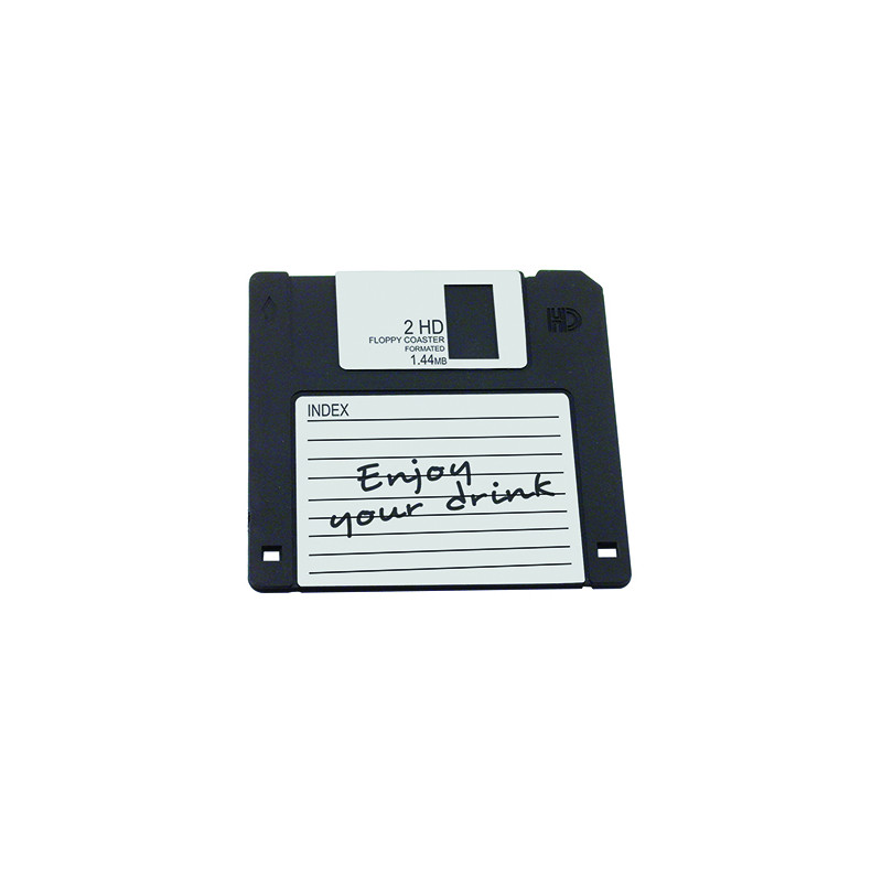 Sottobicchiere Floppy Disc in gomma naturale a forma di floppy disc. Adatto per servire cocktail particolari.